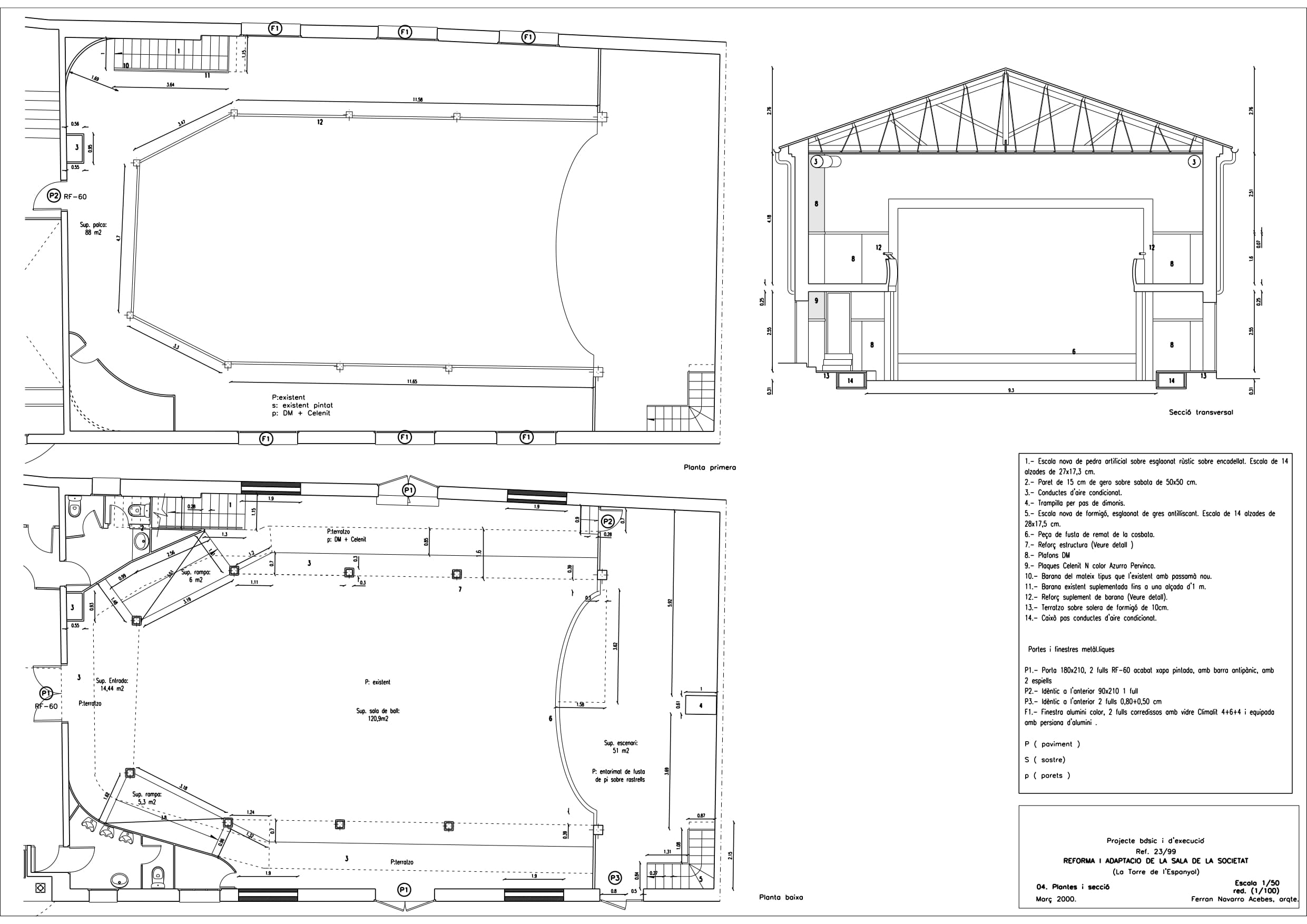 A la planta baixa se substituirà el graó d’accés al canvi de nivell lateral per dues rampes del 7,15 % de pendent, i s’ampliarà l’amplada de la sala reculant 70 cm el desnivell. Es reforçaran els pilars de l’estructura de suport de la planta primera mitjançant perfils metàl·lics.